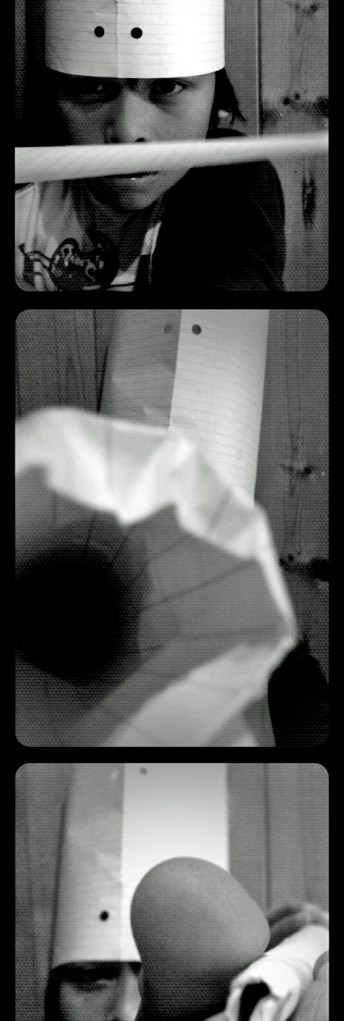 Les garçons sont affublés d’attributs faits de pages arrachées de cahiers Canada. Quelques classiques qu’on peut faire durant la classe, dont l’avion en papier ou l’éventail, mais d’autres objets plus loufoques. Ils s’amusent, déconnent, comme (trop) souvent durant la période des devoirs & leçons… Et certains portraits deviennent des natures mortes tant l’objet prend le dessus, venant caché le petit homme qui n’en peut plus de bien faire…