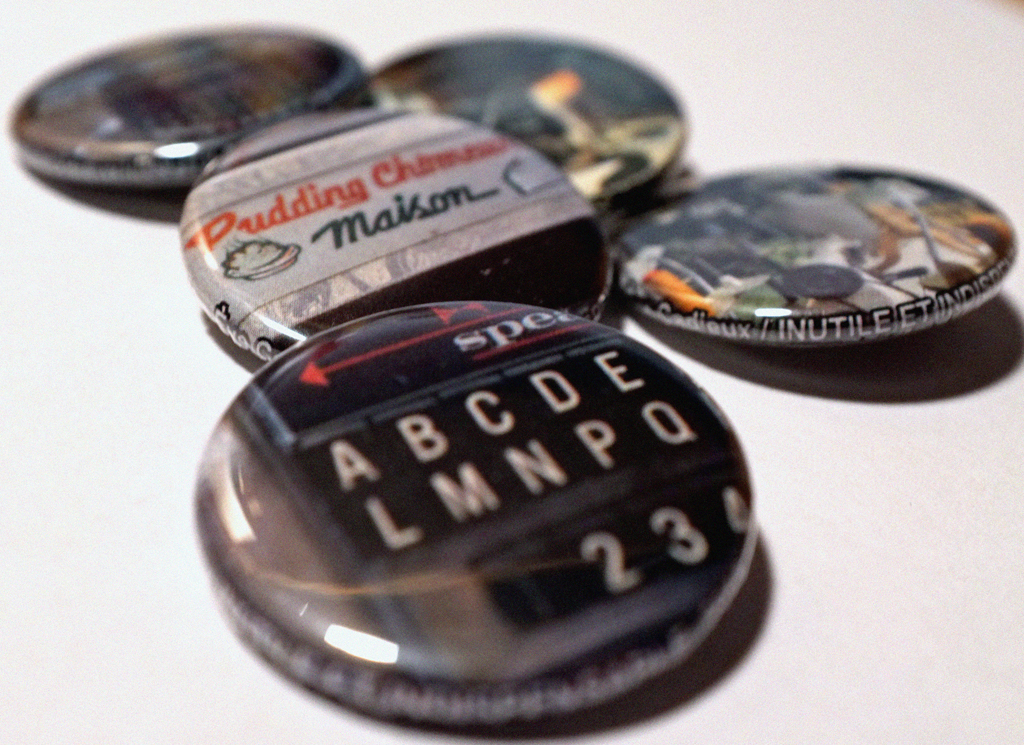 Ève Cadieux s’intéresse aux lieux et objets urbains surannés, abandonnés ou pas encore, qui signalent assurément une autre époque. Des espaces d’enracinement mnémonique, plus que physique. L’installation photographique INUTILE ET INDISPENSABLE montre des fragments d’endroits au caractère obsolète, que l’artiste considère nécessaires pour se rappeler qui nous sommes, à travers ce que nous avons été. Quatre très grandes images deviennent de faux panneaux publicitaires. Il y a des macarons – cinq modèles à collectionner – circulant dans le Montréal souterrain, dès le 1er mars 2014 en soirée, et offerts à qui les trouve.