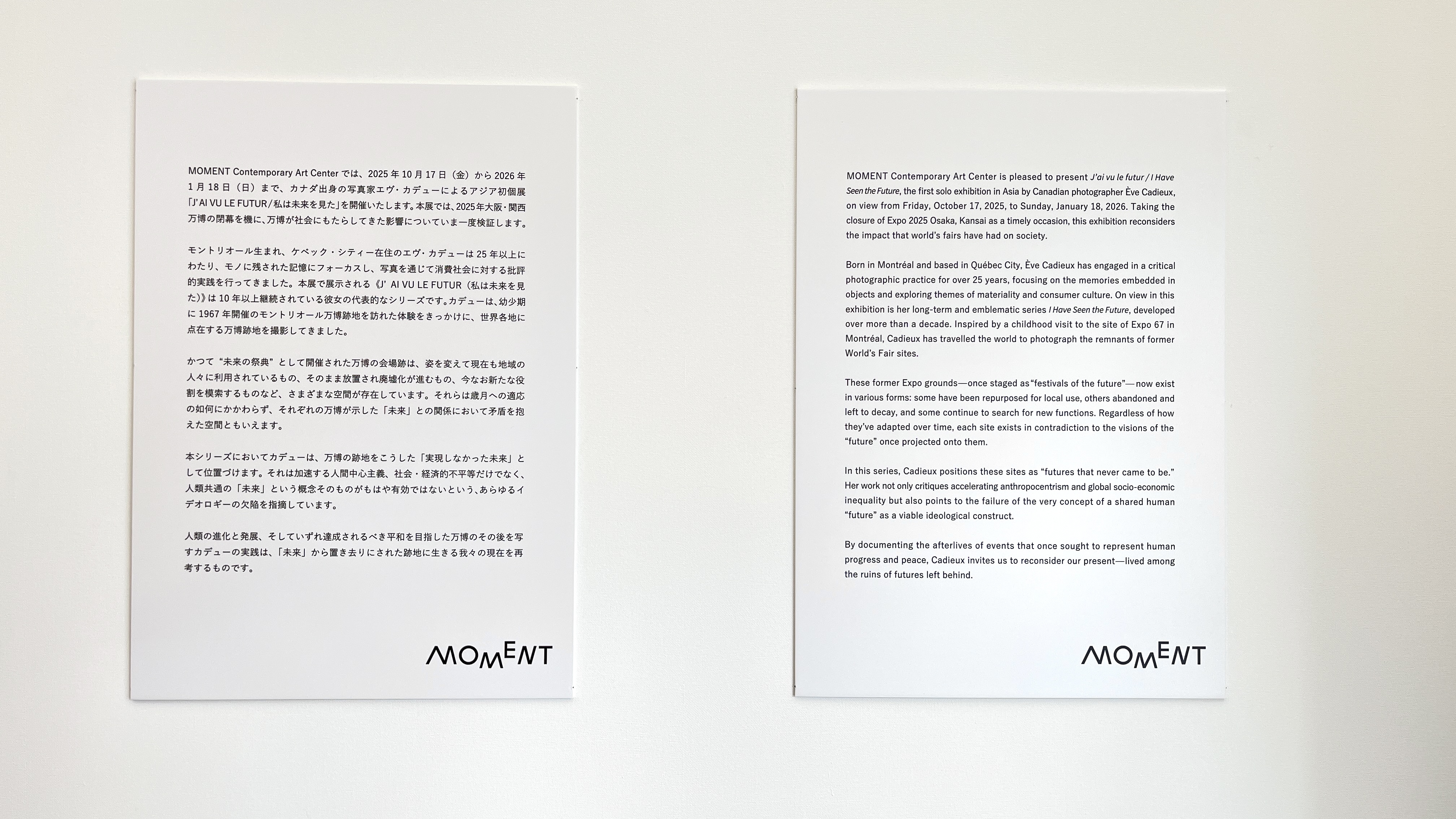 MOMENT Contemporary Art Centerでは、2025年10月17日(金)から2026年1月18日(日)まで、カナダ出身の写真家エヴ・カデューによるアジア初個展「J’AI VU LE FUTUR / 私は未来を見た」を開催いたします。本展では、2025年大阪・関西万博の閉幕を機に、万博が社会にもたらしてきた影響についていま一度検証します。