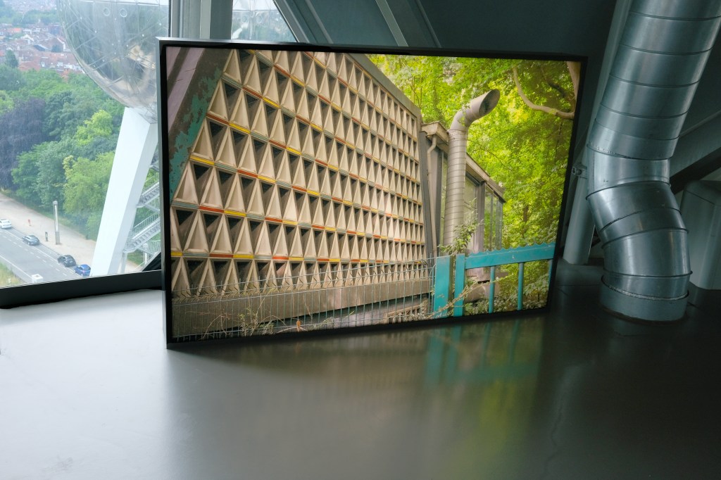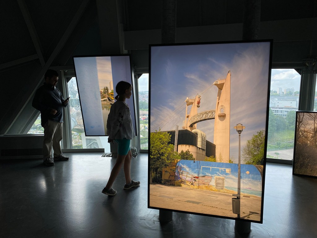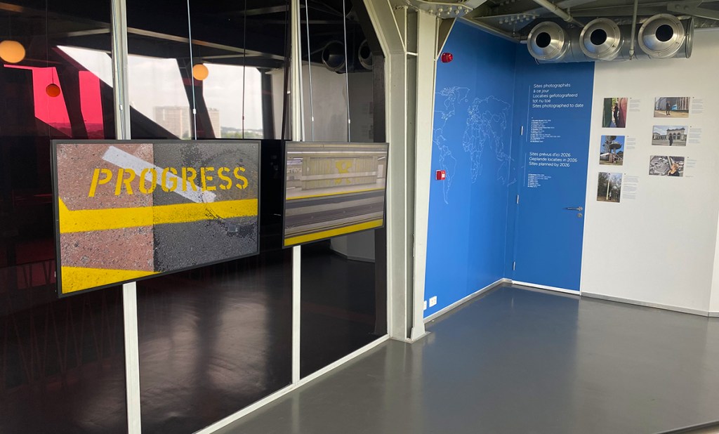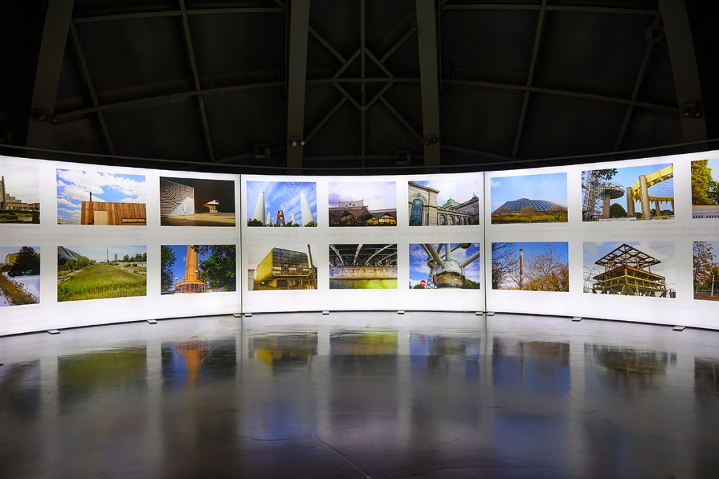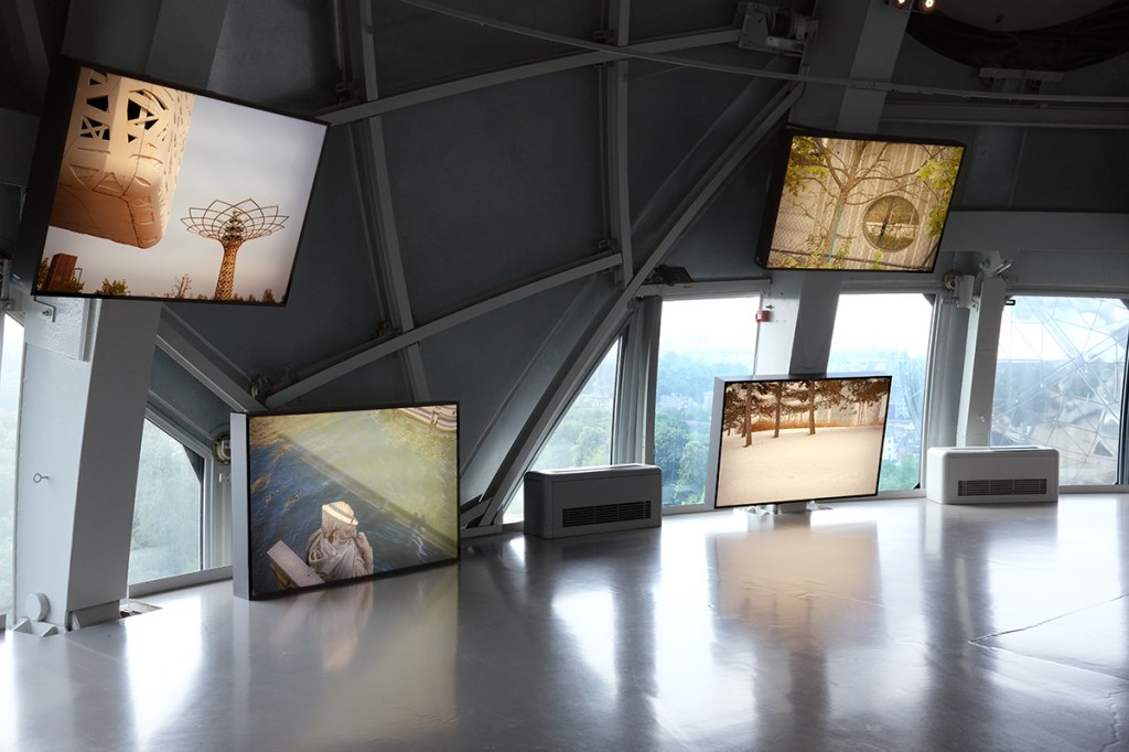L’installation est présentée sur les 2 niveaux d’une sphère de l’Atomium, et comprend 72 grandes photographies présentées sur quatre types de surfaces lumineuses : mur rétroéclairé, caissons lumineux, verre et moniteurs. // The installation is presented on 2 levels of a sphere at Atomium, and includes 72 large photographs presented on four types of luminous surfaces: backlit wall, light boxes, glass and monitors.