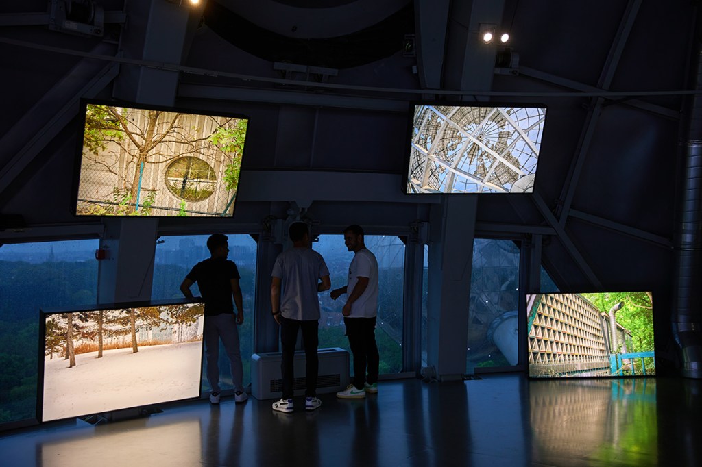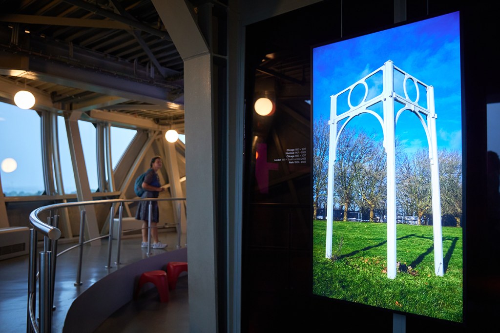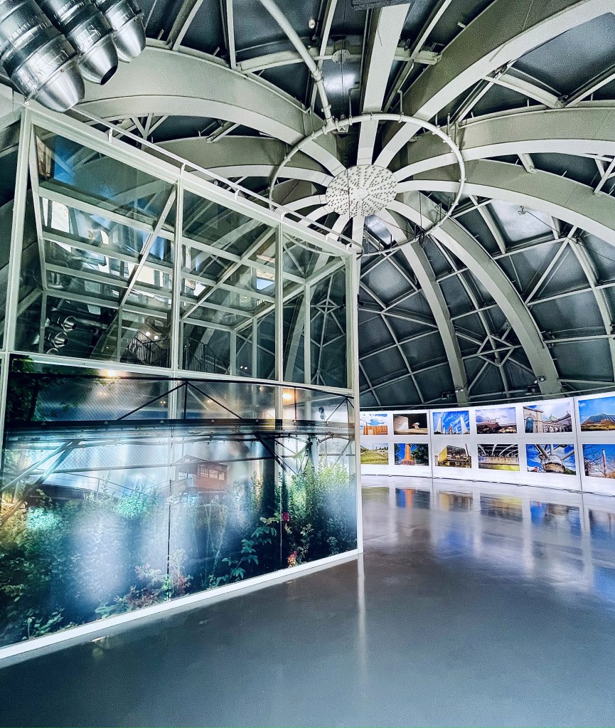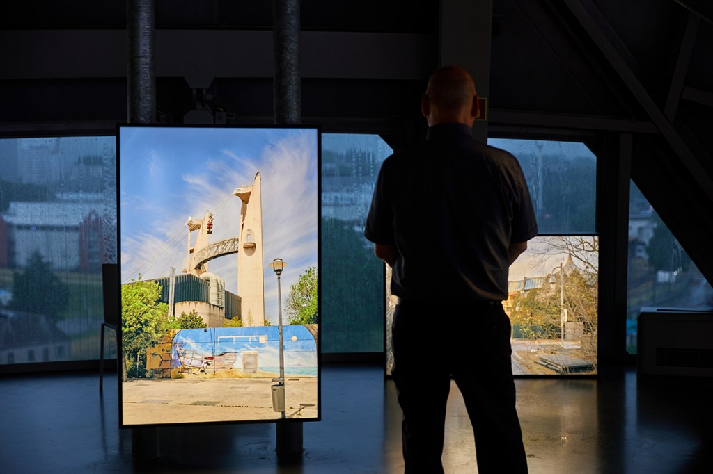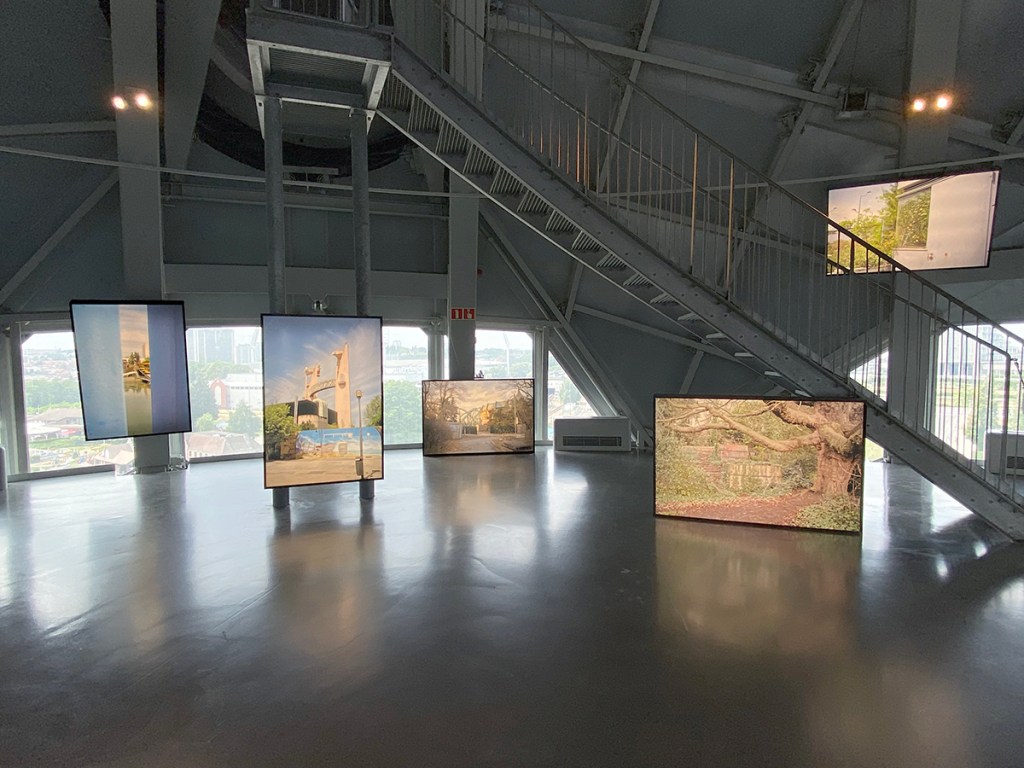 L’installation est présentée sur les 2 niveaux d’une sphère de l’Atomium, et comprend 72 grandes photographies présentées sur quatre types de surfaces lumineuses : mur rétroéclairé, caissons lumineux, verre et moniteurs. // The installation is presented on 2 levels of a sphere at Atomium, and includes 72 large photographs presented on four types of luminous surfaces: backlit wall, light boxes, glass and monitors.